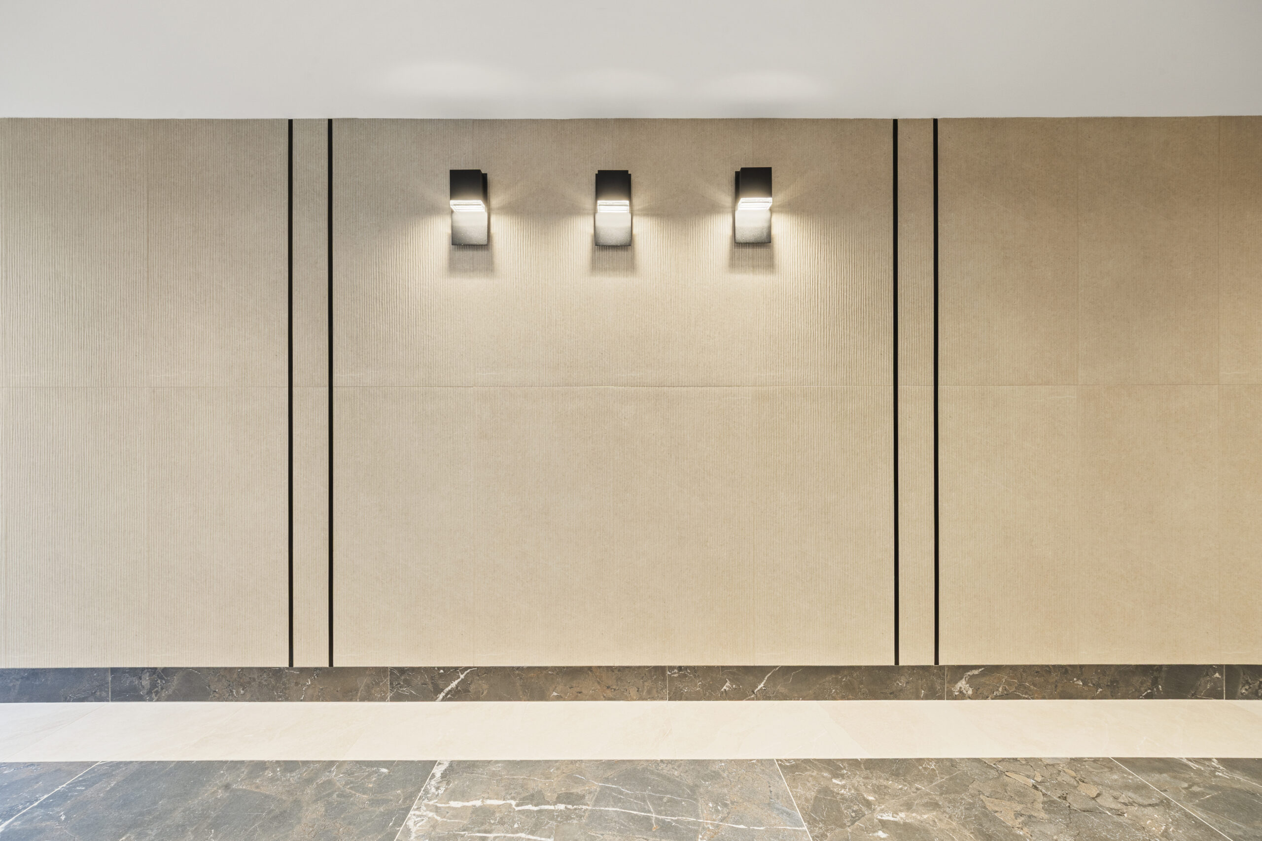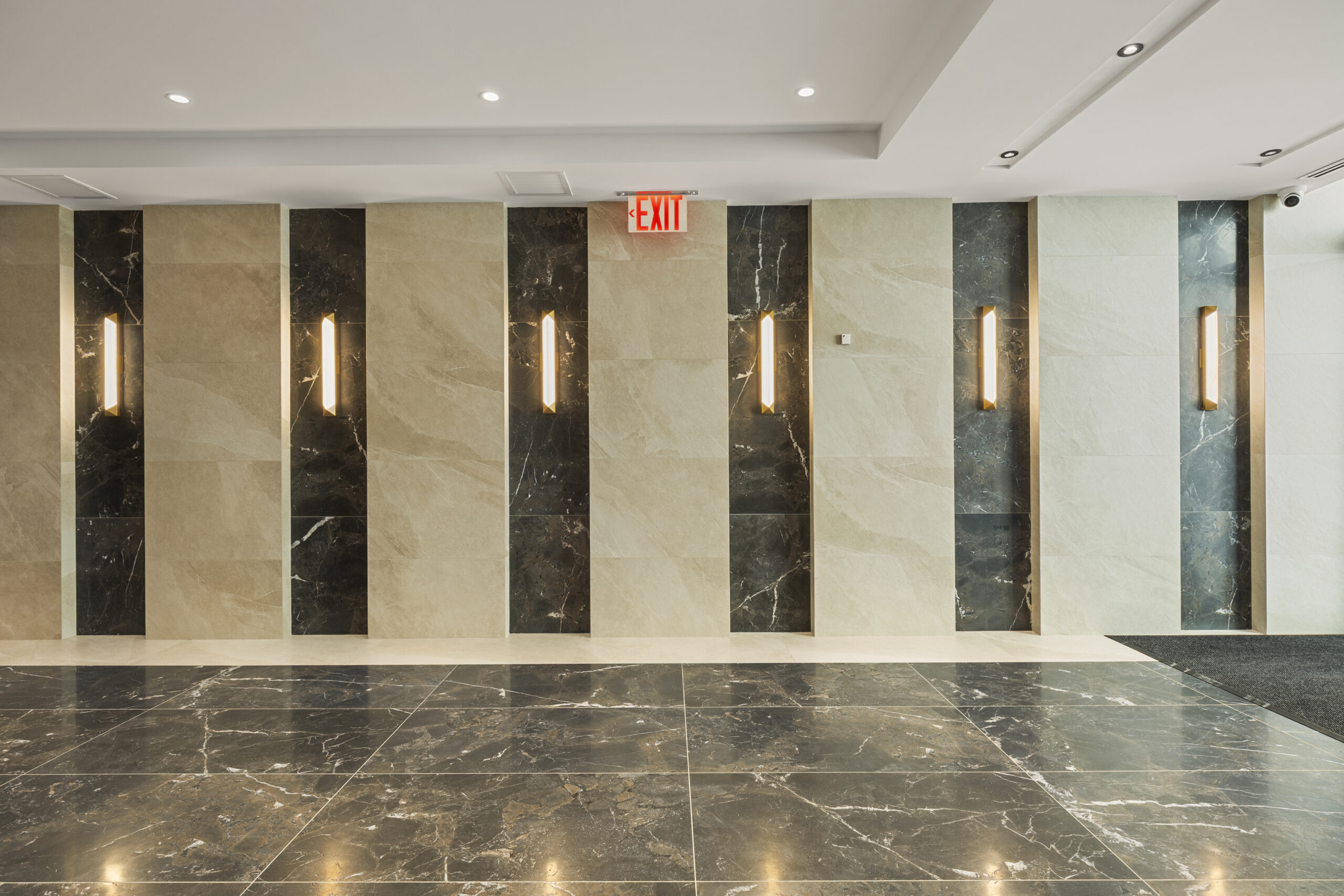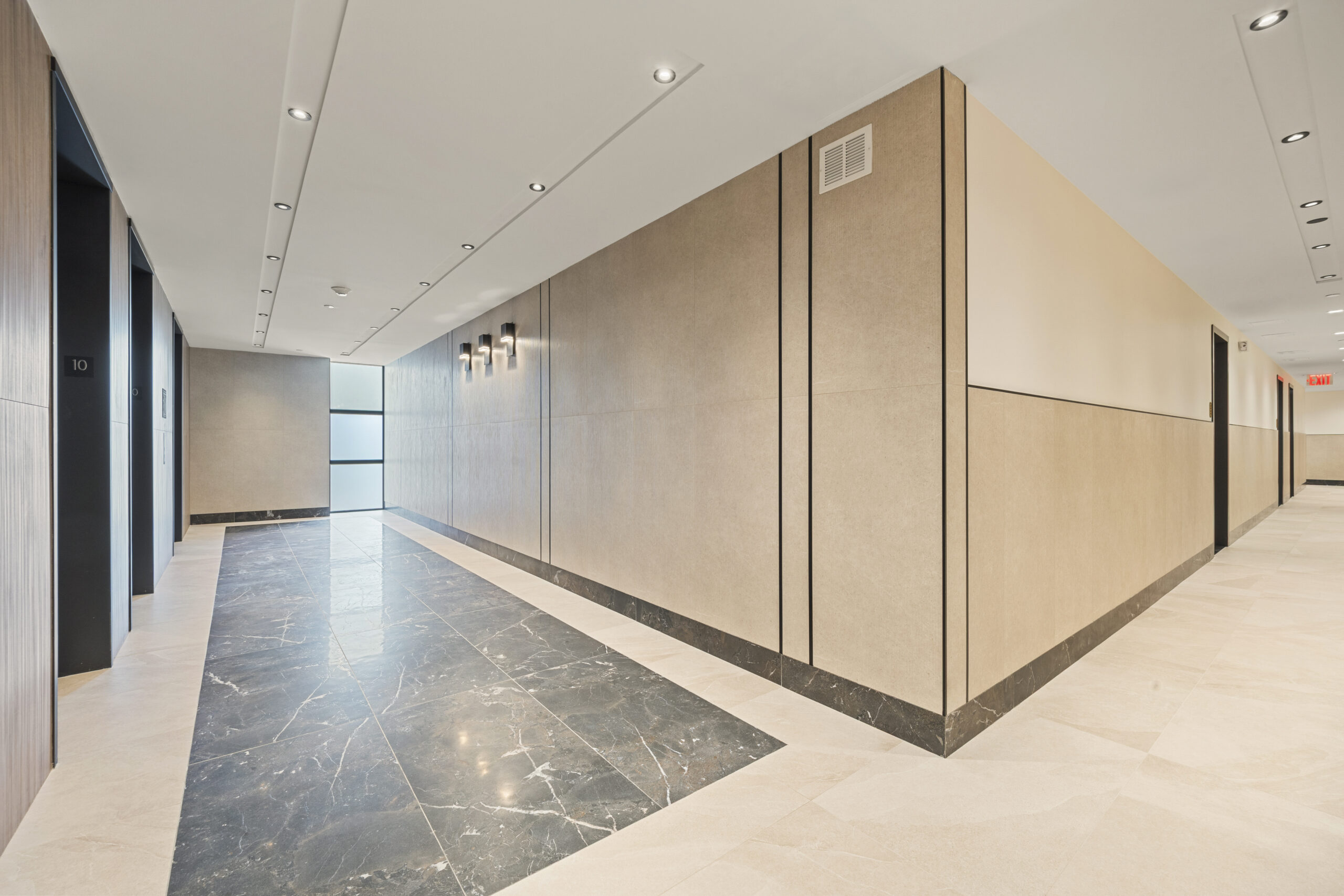 Our craftsmanship is showcased throughout the development’s varied spaces, beginning with the expansive ground-floor retail area, which spans over 22,000 square feet. In this bustling commercial space, we installed tiles that offer both durability and aesthetic appeal, perfectly complementing the building’s distinctive dark gray and red brick exterior. The medical office facility also reflects our skill in crafting specialized environments where hygiene and design go hand in hand.