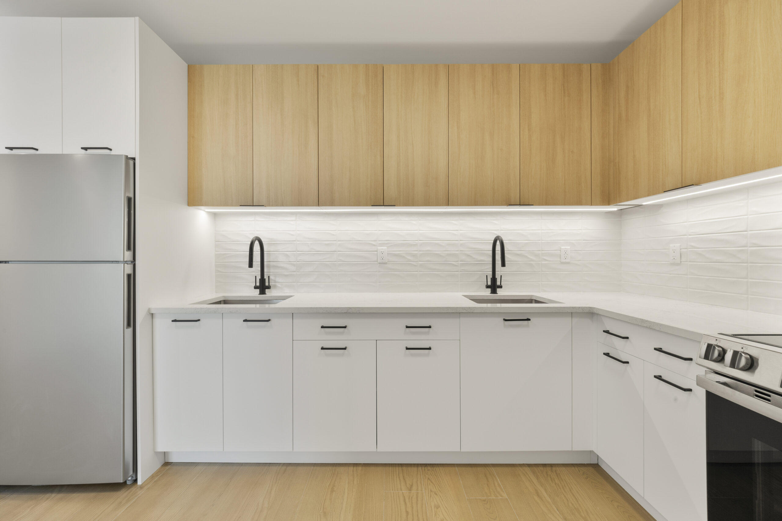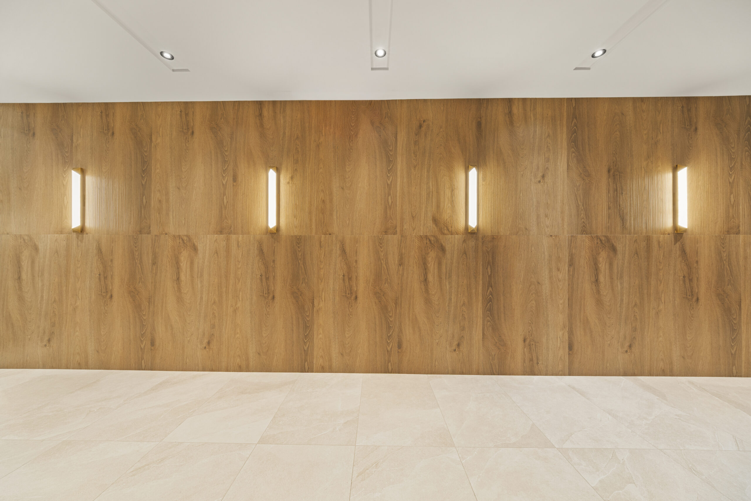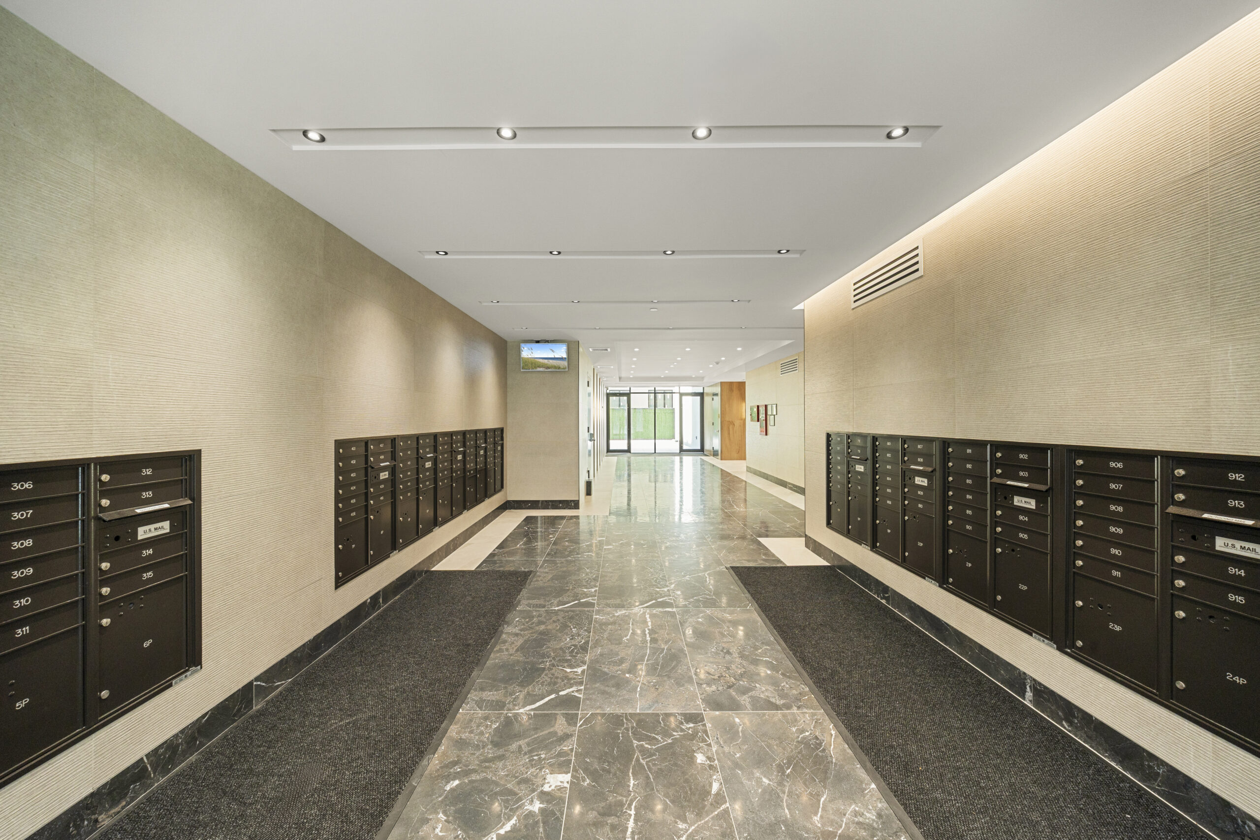 Our craftsmanship is showcased throughout the development’s varied spaces, beginning with the expansive ground-floor retail area, which spans over 22,000 square feet. In this bustling commercial space, we installed tiles that offer both durability and aesthetic appeal, perfectly complementing the building’s distinctive dark gray and red brick exterior. The medical office facility also reflects our skill in crafting specialized environments where hygiene and design go hand in hand.
